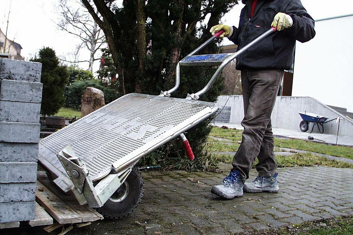Block Carts make light work of transporting pavoirs and blocks directly from the pallet to where they are being laid. A clever lever system clamps the bottom row of blocks firmly for transport. Has pneumatic tyres to enable progress over rough terrain.