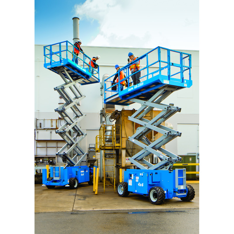 These scissor lifts can be operated from the platform or the ground. Recommended for use outdoors and comes equipped with foam-filled tyres and outriggers for work on rough ground.