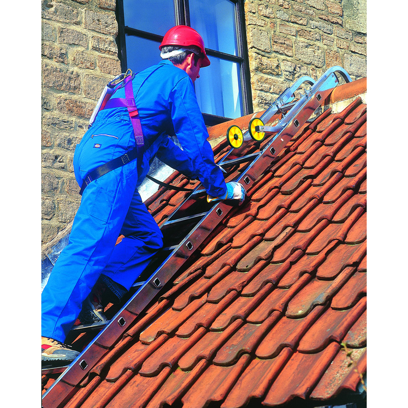 Used for accessing sloped roof areas. Rolled up the roof on the wheels it is then secured to the ridge by means of a hook. Available in fixed or extendable versions.
